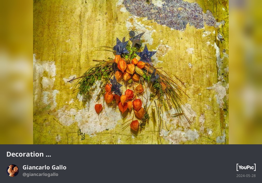 Fotografia https://youpic.com/giancarlogallo/412105111884326/953311270739968 La fotografia riprende una decorazione appesa ad una vecchia parete, fatta tutta con elementi naturali a caratte floreale.…